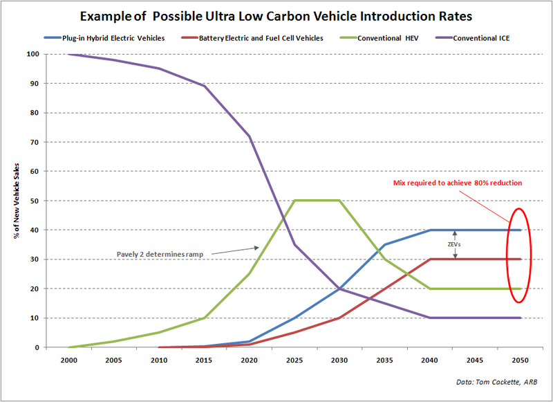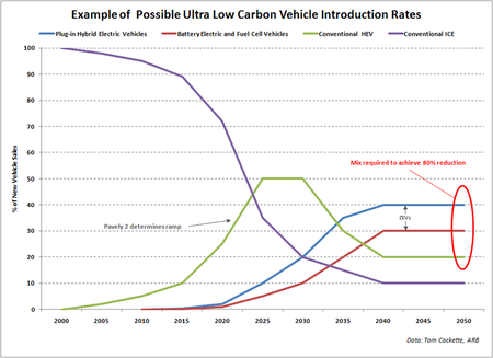 Les prévisions d’évolution des marchés à plus de 5 ou 10 ans ne veulent pas dire grand chose puisque, par définition, celui qui élabore ces prévisions ignore les innovations à venir et ne connaît pas le contexte politique et économique de ce futur imaginaire. Ces prévisions donnent cependant une image des convictions du moment. C’est ainsi qu’un représentant du California Air Resources Board vient de faire une présentation à l’Advanced Automotive Battery Conference 2009 sur une hypothèse d’évolution des ventes de voitures neuves à l’horizon 2050 en Californie, en sachant qu’au terme les émissions de CO2 et autres gaz devront être réduites de 80% par rapport à celles enregistrées en 1990 (FIG.).
