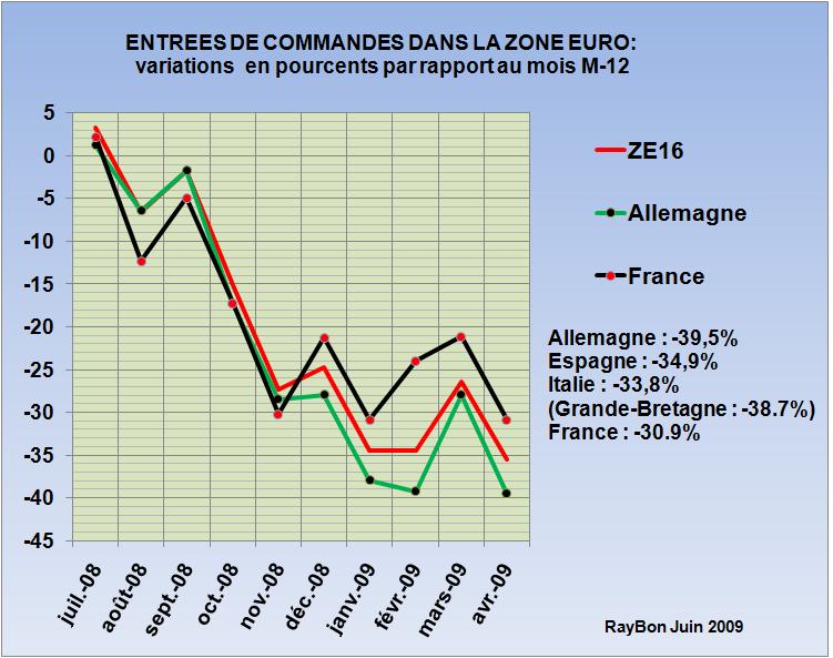 Avec des entrées de commandes à l’industrie du mois d’Avril comprises entre -30% et -40% par rapport à il y a un an pour les grands pays européens (FIG.), un observateur objectif ne peut être que pessimiste sur l’évolution de la crise dans les mois à venir en Europe. C’est l’Allemagne avec un score proche de -40% qui est la plus touchée. Les espoirs annoncés, de-ci et de-là, de reprise ou de stabilisation de l’économie, semblent pour l’instant bien compromis.