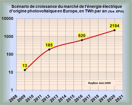 Les industriels et financiers qui évoluent dans le champ des énergies renouvelables dans le monde doivent se persuader d’une règle économique évidente : de copieuses subventions unitaires sont compatibles avec de faibles volumes de production, mais elles devront rapidement décroître puis devenir nulles si les acteurs veulent accéder à de grands volumes de production. L’année 2008 en Espagne, avec un brusque arrêt des autorisations d’implantations des modules solaires, a clairement démontré qu’un Gouvernement, aussi écolo soit-il, ne pouvait pas subventionner à fonds perdus toutes les ambitions photovoltaïques qui se présentaient. L’EPIA (European Photovoltaic Industry Association) vient de publier une étude assez délirante qui envisage qu’en 2020 le photovoltaïque en Europe assurerait plus de la moitié de la ressource électrique globale (FIG.).