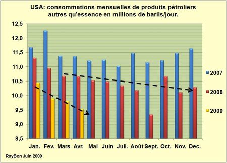 L’Energie Information Administration américaine vient de publier les données de consommation en produits pétroliers du mois d’Avril. Il apparaît que les consommations de ce mois sont en baisse de 6,6% par rapport à l’an dernier (-1,3 millions de barils/jour) et qu’en cumulé sur les quatre premiers mois de 2009 la baisse atteint 5,6% par rapport à l’an dernier. Alors que les consommations d’essence affichent un retrait limité de 1,5% sur le quadrimestre, ce sont les consommations des produits autres que l’essence qui affichent un important retrait de 9% (FIG.). L’utilisation de gasoil est en retrait de 9%, celle de kérosène recule de 10%, les gaz liquéfiés sont en retrait de 8%. Ces produits, autres que l’essence, représentent encore plus de la moitié des consommations de pétrole américaines.