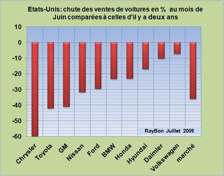 Le mois de Juin, à 858 mille véhicules vendus dans le mois, affiche une chute des ventes américaines de véhicules en unités de 30% par rapport à il y a un an et de 36% par rapport à il y a deux ans (-430 mille exemplaires). En cumulé sur le premier semestre la chute est de 35% par rapport à 2008 et de 42% par rapport à 2007. En effet pour obtenir une bonne évolution du marché automobile américain il est préférable de prendre pour référence 2007 qui était l’année de tous les succès de ventes. L’année 2008, en raison de la montée débile des cours du pétrole, avait déjà connu une chute des ventes, en particulier de celle des 4X4. Cette comparaison de Juin 2009 par rapport à Juin 2007 permet d’illustrer le fait que tous les constructeurs ne sont pas égaux devant la chute des ventes (FIG.). Si Chrysler affiche une baisse spectaculaire de 60% en deux ans, on constate, de l’autre côté de l’éventail, que les ventes de Volkswagen n’ont baissé que de 7%. En effet en 2008 à cette date les ventes de VW avaient progressé de 14%. De plus, certains modèles de VW équipés de moteurs diesel, représentant 26% des ventes du constructeur allemand, rencontrent un succès certain aux USA. Après tout, l’offre diesel est une bonne façon de se démarquer et de présenter des consommations de carburant attrayantes. La chute des ventes de Toyota en deux ans est également impressionnante, au coude à coude avec celle de GM. Toyota était devenu trop américain aux Etats-Unis.