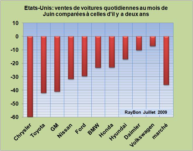 Le mois de Juin, à 858 mille véhicules vendus dans le mois, affiche une chute des ventes américaines de véhicules en unités de 30% par rapport à il y a un an et de 36% par rapport à il y a deux ans (-430 mille exemplaires). En cumulé sur le premier semestre la chute est de 35% par rapport à 2008 et de 42% par rapport à 2007. En effet pour obtenir une bonne évolution du marché automobile américain il est préférable de prendre pour référence 2007 qui était l’année de tous les succès de ventes. L’année 2008, en raison de la montée débile des cours du pétrole, avait déjà connu une chute des ventes, en particulier de celle des 4X4. Cette comparaison de Juin 2009 par rapport à Juin 2007 permet d’illustrer le fait que tous les constructeurs ne sont pas égaux devant la chute des ventes (FIG.). Si Chrysler affiche une baisse spectaculaire de 60% en deux ans, on constate, de l’autre côté de l’éventail, que les ventes de Volkswagen n’ont baissé que de 7%. En effet en 2008 à cette date les ventes de VW avaient progressé de 14%. De plus, certains modèles de VW équipés de moteurs diesel, représentant 26% des ventes du constructeur allemand, rencontrent un succès certain aux USA. Après tout, l’offre diesel est une bonne façon de se démarquer et de présenter des consommations de carburant attrayantes. La chute des ventes de Toyota en deux ans est également impressionnante, au coude à coude avec celle de GM. Toyota était devenu trop américain aux Etats-Unis.