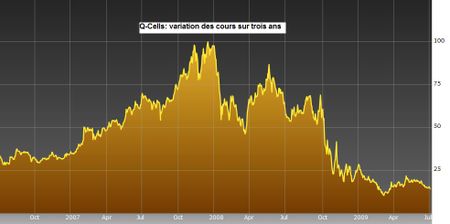 Q-Cells leader mondial de l’industrie des cellules et des modules photovoltaïques a profité pendant longtemps d’une politique énergétique allemande favorable aux ressources alternatives comme le solaire. Ce support financier abondant et constant du Gouvernement allemand, payé par le consommateur, a permis à Q-Cells de devenir le leader mondial, doublant même le japonais Sharp, handicapé par un arrêt momentané des aides financières du gouvernement nippon. Ses productions de modules sont essentiellement à base de Silicium cristallin, malgré une diversification amorcée dans les modules en couches minces au travers de filiales. Mais si les trop copieuses aides d’Etat ont d’excellentes vertus pour lancer une industrie nouvelle, elles ont un large défaut: elles créent une industrie de rente peu motivée à faire des gains de productivité et surtout elles attirent la concurrence des pays à faible coûts comme la Chine ou Taïwan. Le marché voit se dérouler en ce moment un formidable renversement, accéléré par la crise financière et économique: cette industrie de composants va peu à peu quitter l’Europe, pour se localiser en Asie où le Silicium et la main d’oeuvre pour assembler les modules sont à des tarifs défiant toute concurrence. En parallèle les prix de marché du Silicium, des wafers et des modules, devant une offre chinoise pléthorique, amorcent une chute non anticipée. Le Marché boursier a bien pris en compte cette nouvelle donne, il suffit d’examiner la courbe des cours de Q-Cells pour comprendre que les données fondamentales ont été bouleversées en trois ans (FIG.).