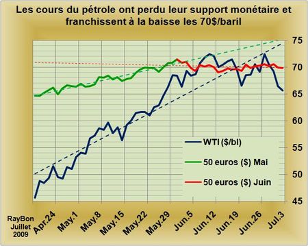 Les professionnels l’avouent eux mêmes, le marché du pétrole constitue un vaste Casino animé par quelques centaines de courtiers plus ou moins allumés. Mais cet état de fait semble particulièrement bien satisfaire les autorités politiques qui n’y voient rien à redire et rechignent à encadrer plus strictement l’accès à la Salle de Jeu, comme cela se fait dans tous les Casinos. Alors que dire de ce vaste marché qui a connu un remarquable rallye au mois de Mai (FIG., courbe bleue), indexé avec un puissant levier sur la baisse des cours du dollar (FIG., courbe verte, de 50 euros exprimés en dollars), jouant ainsi le rôle de couverture vis à vis des variations de change. Mais depuis le début du mois de Juin la baisse du dollar est stoppée, faute de devise alternative crédible. La crise économique en Europe et les chamailleries de politique monétaire au sein de la BCE disqualifient l’euro, la Livre Sterling ne fait plus le poids, le Yen, monnaie d’un pays vieillissant n’a pas l’envergure nécessaire. Alors le dollar est condamné à demeurer la monnaie de réserve mondiale et sa baisse n’a plus de raison d’être (FIG., courbe rouge des mêmes 50 euros au mois de Juin). Les Bons du Trésor américains trouvent preneur et les taux longs se relaxent, autour de 3,5% pour le 10 ans. Depuis le début du mois de Juin, le pétrole a perdu son seul support monétaire qui justifiait sa hausse, son cours était donc appelé à se relaxer (LIRE).