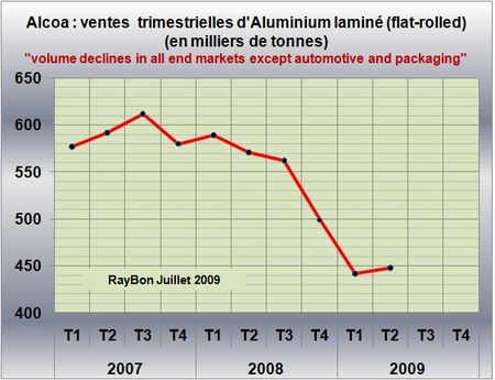 Les ventes trimestrielles d’Aluminium sous forme de produits plats laminés (flat-rolled) d’Alcoa ont présenté une chute entre 2008 et 2009 de 130 mille tonnes (FIG.). Elles représentaient 65% des productions d’Aluminium du Groupe en 2007, elles n’en représentent plus que 50% en 2009. Ce retrait explique la chute des productions globales d’aluminium qui sont passées de plus d’un million de tonnes par trimestre, à 900 mille tonnes au T2 2009. Durant le deuxième trimestre de cette année les ventes de ces produits plats, très utilisés dans la confection des films d’emballage ou des pièces embouties, sont restées au niveau de celles du premier trimestre. De l’aveu d’Alcoa ce sont tous les secteurs qui sont en retrait, à l’exception de l’automobile (au plus bas) et de l’emballage. Ces chiffres ne sont pas indicateurs d’une reprise imminente de l’économie mondiale et confirment les doutes exprimés auparavant sur une hypothétique reprise (LIRE).
