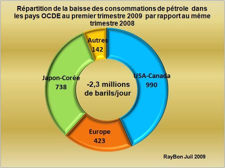 L’ensemble, tenant compte d’une légère reprise économique en Asie, conduit à une baisse de consommation de pétrole mondiale de 1,55 millions de barils/jour pour 2009 soit de 1,5%, à moins de 84 millions de barils/jour.