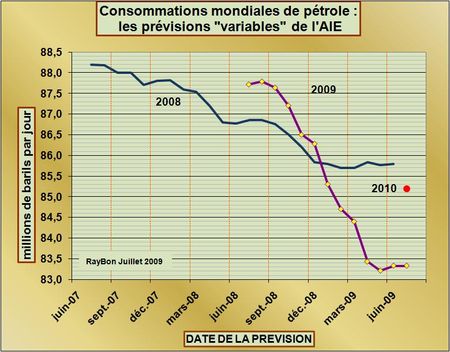Il y a belle lurette que les prévisions de l’Agence Internationale de l’Energie ne font plus frémir les marchés. Tout au plus arrivent-elles à faire sourire les professionnels tant elles peuvent apparaître parfois comme farfelues. Les prévisions à l’été 2007 pour les consommations 2008 (FIG., courbe bleue) avaient prévu un totalement inattendu 88,2 millions de barils/jour qui finit au dessous de 86 millions. Celles de l’été 2008 (courbe parme) avaient prévu une reprise pour 2009!! à 87,7 millions de barils/jour, …. nous en sommes à 83,3 millions. Ces deux exemples illustrent la précision à 18 mois des prévisions de l’Agence. Alors lorsqu’elle prévoit en ce mois de Juillet, 85,2 millions de barils/jour de consommation moyenne de pétrole en 2010 (point rouge) il faut conserver ce sentiment d’imprévisibilité des choses, sinon d’incertitude, qui donne tant de piquant à l’aventure humaine. Alors pour être moins pédant que cette Agence, disons que la consommation moyenne de pétrole pour 2010 devrait se situer dans un intervalle compris entre 83 et 85 millions de barils. A un an et demi de l’échéance une telle précision semble raisonnable, tellement les scénarios peuvent varier.