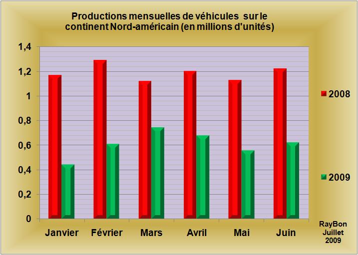 Les productions de voitures en Amérique du Nord se sont élevées au mois de Juin à 621 mille exemplaires, ce qui représente la moitié des productions réalisées en 2008 durant le même mois. En cumulé sur les six premiers mois ces productions atteignent les 3,58 millions d’exemplaires, elles aussi à la moitié des productions de 2008 durant le premier semestre. Chrysler depuis deux mois a quasiment stoppé ses productions (6000 exemplaires produits). GM en faillite, a divisé en Juin ses flux par quatre à 76 mille exemplaires. Seul Ford à 153 mille voitures a dépassé la barre des 100 mille exemplaires produits. C’est un véritable séisme industriel qui s’est abattu sur l’Amérique. L’Administration Obama est en train de mesurer l’ampleur des dégâts. Les producteurs américains ne savent pas définir et produire les modèles qui séduiraient leurs clients: cela s’appelle une crise de l’offre, et c’est long à soigner.