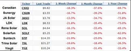 Le Marché semble ne pas croire à l’efficacité des divers plans de relance chinois ou américains destinés à soutenir les industries photovoltaïques. La faute à une baisse des prix de cette industrie de composants, conséquence d’une très large surcapacité de production dans le monde (LIRE). Les cours en Bourse des Sociétés de ce secteur en font les frais. Il a été mentionné ici (LIRE) la forte chute des cours de Q-Cells le N°1 allemand qui à 12,7 euros, a perdu 50% de sa valeur depuis le début de l’année. De même le Norvégien REC, grand spécialiste du Silicium, des wafers et autres cellules voit son cours se réduire de plus d’un tiers depuis le début de l’année. Mais ce phénomène de repli touche également de plein fouet les Groupes chinois du photovoltaïque (TAB.). Le N° 1 chinois Suntech a perdu 22% cette semaine, son challenger, Yingli a laissé 26%. Le producteur de wafers, LDK, abandonne pour sa part 22% dans la semaine et 75% sur les 12 derniers mois. En effet, malgré une reprise des commandes au mois de Juin, en raison de la baisse continue des cours du Silicium, nombreux sont ceux qui pensent que les fabricants de wafers ne pourront pas maintenir leurs marges. Ces variations de cours à quelques jours des annonces des résultats du deuxième trimestre, n’augurent rien de très bon.