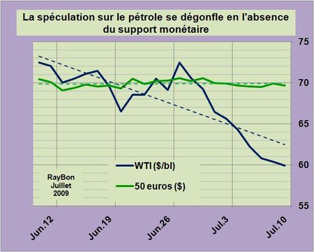 Après un mois de Mai limpide où les cours du pétrole croissaient, avec un important effet de levier, au rythme de la dépréciation quasi monotone du dollar, la spéculation s’est mécaniquement poursuivie au début du mois de Juin jusqu’à 72 dollars le baril, pour finalement s’apercevoir que le support monétaire avait disparu. La chute du dollar était interrompue, faute de devise alternative. « Monde multipolaire et donc multimonétaire » font parties des pseudos postulats sans réelle signification opérationnelle. Les monnaies autres que le dollar ne présentent pas l’assise politique ou la convertibilité nécessaire à supplanter le billet vert. L’euro en particulier souffre d’une Europe économiquement affaiblie par la crise et politiquement désunie jusque dans ses instances bancaires centrales. Ce seul constat a enrayé la chute du dollar et provoqué la baisse du baril de brut vers les 60 dollars prévus (FIG.).