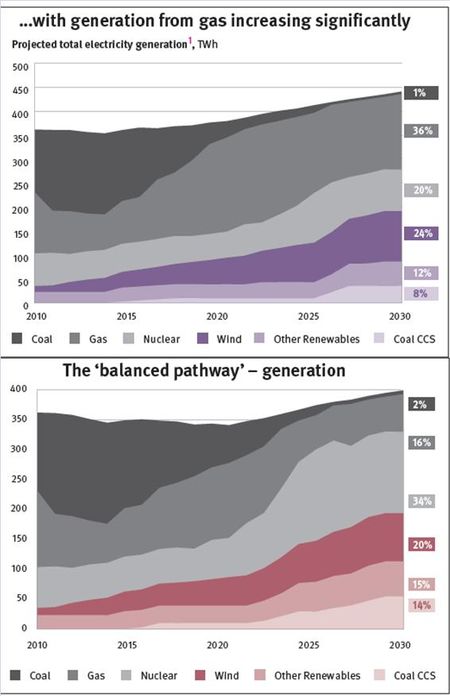 La « Confederation of British Industry », s’appuyant sur une étude de McKinsey, vient de faire une contre-proposition au schéma gouvernemental (FIG., graphique du haut) général d’évolution du mix électrique britannique d’ici à 2030. Cette proposition appelée « balanced pathway » (FIG., graphique du bas) propose pour des questions essentiellement de maîtrise des coûts de l’énergie électrique et d’atteinte de l’objectif d’émission de CO2 en 2030, d’accroître la part du nucléaire aux dépens de l’énergie éolienne et des centrales au gaz naturel. Cette étude préconise de réduire l’objectif de consommation d’électricité à 400 TWh en 2030 ce qui représente une quasi stagnation des consommations. Elle demande d’investir plus dans le nucléaire pour porter sa part de génération en 2030 à 34% au lieu des 20% retenus à ce jour. Les centrales au charbon équipées de CCS sont également encouragées en portant leur part à 14% au lieu de 8% dans le scénario officiel. En conséquence les besoins de génération au gaz naturel (16% au lieu de 36%) et éoliens (20% au lieu de 24%) décroissent.