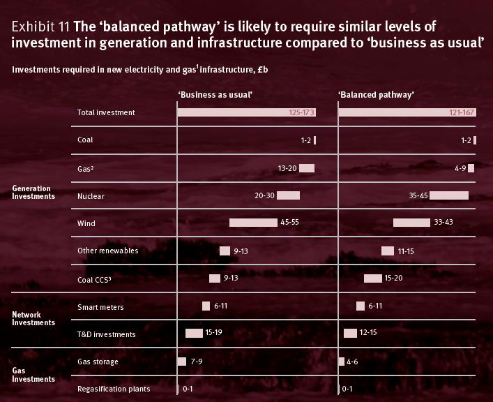 La « Confederation of British Industry », s’appuyant sur une étude de McKinsey, vient de faire une contre-proposition au schéma gouvernemental (FIG., graphique du haut) général d’évolution du mix électrique britannique d’ici à 2030. Cette proposition appelée « balanced pathway » (FIG., graphique du bas) propose pour des questions essentiellement de maîtrise des coûts de l’énergie électrique et d’atteinte de l’objectif d’émission de CO2 en 2030, d’accroître la part du nucléaire aux dépens de l’énergie éolienne et des centrales au gaz naturel. Cette étude préconise de réduire l’objectif de consommation d’électricité à 400 TWh en 2030 ce qui représente une quasi stagnation des consommations. Elle demande d’investir plus dans le nucléaire pour porter sa part de génération en 2030 à 34% au lieu des 20% retenus à ce jour. Les centrales au charbon équipées de CCS sont également encouragées en portant leur part à 14% au lieu de 8% dans le scénario officiel. En conséquence les besoins de génération au gaz naturel (16% au lieu de 36%) et éoliens (20% au lieu de 24%) décroissent.