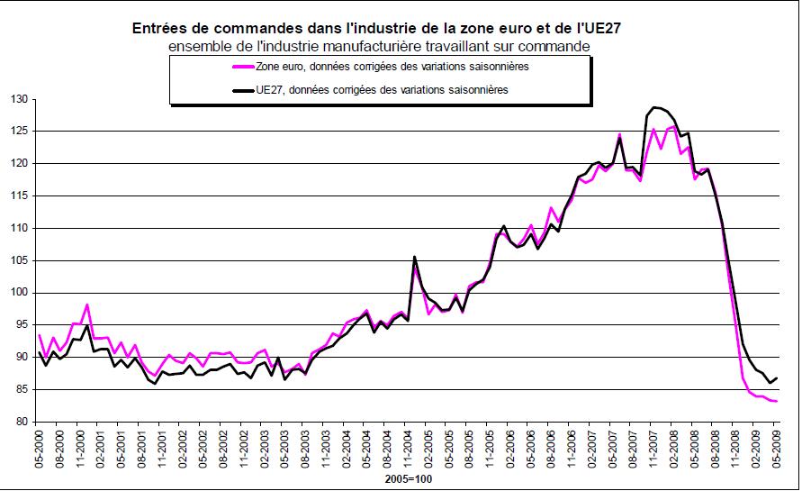 Le mirage de la reprise économique en Europe vient de se brouiller un peu plus avec des statistiques d’entrées de commandes à l’industrie au mois de Mai toujours sur le déclin. Eurostat, pour un indice 100 en 2005, publie des entrées de commandes corrigées des variations saisonnières à l’indice 83 pour la Zone Euro (FIG.), avec des scores de 73 pour l’Espagne, de 83 pour la France et de 85 pour l’Allemagne. Ces chiffres rendent bien hypothétique une éventuelle reprise d’ici à la fin de l’année, même si la santé des banques d’affaires américaines, financée par la spéculation, va beaucoup mieux.