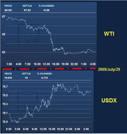 Par contre depuis deux jours le dollar a amorcé un mouvement de reprise vis à vis de l’euro et les cours du pétrole WTI hier à New York ont suivi l’évolution de l’indice USDX, panier des taux de change du dollar avec les principales monnaies, reflet symétrique habituel de la spéculation sur le pétrole en relation avec les taux de change du dollar (FIG.).