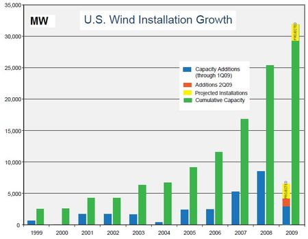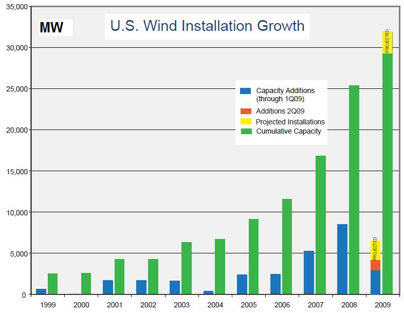 La crise financière est passée par là. Il est un secret de Polichinelle de révéler que peut être les producteurs d’éoliennes et leurs sous-traitants aux Etats-Unis souffrent d’un manque d’entrées de commandes. Le Book to Bill n’est pas bon. Après un premier trimestre acceptable, avec un volume de 2800 MW de nouvelles turbines installées, le second semestre s’avère être moins brillant avec 1200 MW de nouveaux équipements mis en place révèle l’AWEA (American Wind Energy Association). D’après cette association il est fort probable que cette tendance va se poursuivre durant la deuxième partie de l’année: « elle voit un nombre réduit d’équipements en chantier chez les producteurs d’éoliennes et chez leurs sous-traitants ». Les projections sur le deuxième semestre (barre jaune) conduiraient à des volumes pour 2009 qui seraient donc inférieurs aux réalisations de 2008 (FIG.).