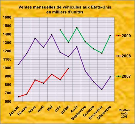 Enfin la troisième raison est la prime à la casse qui a obtenu un grand succès immédiat auprès des possesseurs américains de vieux tromblons de plus de 25 ans. Se faire reprendre son vieux pick-up rouillé pour 4000 dollars en moyenne intéresse beaucoup les américains. Le Gouvernement a estimé que 185 mille véhicules avaient été vendus grâce à ce dispositif pour un montant total de prime à la casse (cash for clunkers) de 775 millions de dollars sur un milliard alloué. Les Sénateurs sembleraient d’accord pour accorder 2 milliards de dollars de plus au programme ce qui permettrait, en tout, de subventionner autour de 750 mille ventes de véhicules durant l’été.