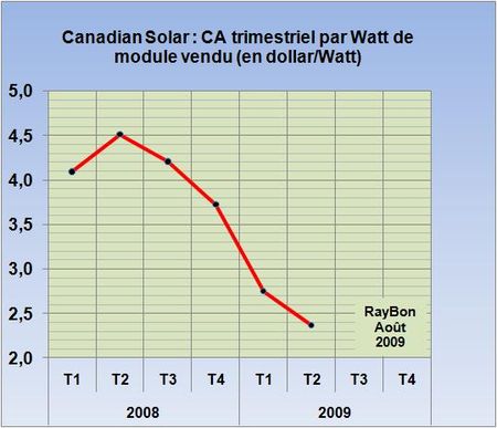 La comparaison des chiffres de ce dernier trimestre connu avec ceux du T2 2008 est instructive sur l’évolution du business: pour des volumes commercialisés sensiblement identiques (47 et 48 MW) le chiffre d’affaire trimestriel est passé de 213 M$ au T2 2008 à 114 M$ aux deuxième trimestre 2009. Illustration d’une radicale baisse des prix (FIG.), phénomène bien connu des industries des composants électriques et électroniques durant les périodes de surproduction.