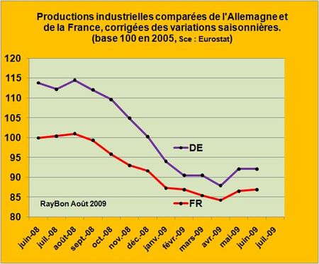 Eurostat nous informe que l’indice production industrielle, corrigé des variations saisonnières, du mois de Juin en Europe est ressorti à 89.8 et que celui de la Zone Euro n’a été guère plus brillant à 88,7 pour une base 100 en 2005. Ces deux indices sont légèrement plus bas que ceux du mois de Mai. Une comparaison des valeurs mesurant les variations des productions industrielles de l’Allemagne et de la France depuis 2005 met en évidence cette profonde stagnation depuis le début de l’année (FIG.). L’activité industrielle allemande qui avait atteint l’indice 115 à l’été 2008, est depuis largement retombée de plus de 20 points. Celle de la France qui n’arrivait péniblement durant l’été 2008, au niveau de celle de 2005 (indice 100), est retombée, elle aussi, de près de 13 points. Cette moindre chute de l’activité industrielle française permet, à ceux qui nous gouvernent, de dire que notre pays résiste mieux à la crise. Effectivement en évitant de monter, on tombe de moins haut!…Monsieur de Lapalisse l’aurait d’ailleurs déjà fait remarquer.