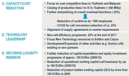 - La fermeture de 4 lignes de production les plus anciennes (360MW) de son usine allemande de Thalheim, accompagnée d’une revue des emplois indirects (overhead). L’ensemble devrait conduire à la suppression de 500 postes et à une réduction des coûts de production de 25%. C’est l’Usine de Malaisie qui devrait prendre l’essentiel du relai.
