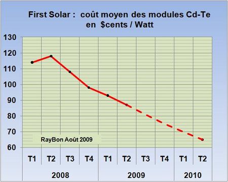 Il apparaît de façon de plus en plus évidente que pour poursuivre sa croissance l’industrie du photovoltaïque va devoir fortement réduire les prix de ses modules, afin que les opérateurs puissent dégager une rentabilité acceptable, malgré des aides tarifaires modérées qui devront tendre vers zéro. Les technologies en couches minces qui permettent de produire, de façon totalement automatisée, des modules de plusieurs m2 de surface, sont appelées à se confronter aux productions de modules chinois, composées essentiellement de cellules issues de wafers de silicium, connectées entre elles. La politique de First Solar qui a réussi à prendre en quelques trimestres la place de N°1 mondial, illustre par sa politique de réduction des coûts et de montée en volumes de production la bonne démarche. Au deuxième trimestre de cette année, l’américain a produit 278 MW de modules contre un peu moins de 220 MW au premier trimestre. Grâce à la montée en puissance des productions de ses usines en Malaisie, le constructeur atteint un coût moyen du Watt produit de 87 cents. Son objectif est d’arriver à 65 cents en 2010 (FIG.).