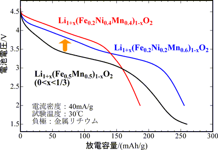 L’AIST reprenant des travaux utilisant des oxydes lithiés contenant du Titane établit une loi empirique montrant que la tension de décharge de ces oxydes dépend de leur teneur cumulées en Fer, Manganèse et Titane (FIG.II).