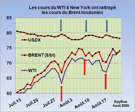 Poussés par un retour en faiblesse du dollar, illustrée par la nouvelle baisse de l’indice USDX et par une baisse des importations de brut et de produits pétroliers aux Etats-Unis, les cours du pétrole à New York ont repris près de 7 dollars par baril durant la semaine, atteignant ainsi les plus hauts de l’année à près de 74$/baril. Le spread entre Brent et WTI, étroitement lié à la saturation du marché physique américain par un excès de produits en stock, est pratiquement revenu à zéro (FIG.), annonçant ainsi un retour au premier plan du marché américain. Le jeu spéculatif des traders entre les cours du NYMEX et ceux de l’ICE à Londres semble être d’une grande complexité pour un non initié.