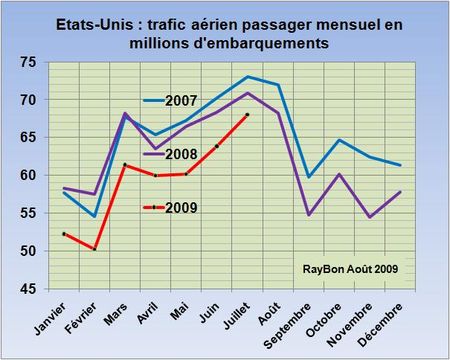 L’Air Transport Association (ATA) américaine qui publie tous les mois, depuis le début de la crise économique, un bulletin sur l’évolution du transport aérien à partir des données communiquées par ses membres, est un peu moins pessimiste que d’habitude sur les résultats en volumes du mois de Juillet. Le transport passager ne serait en retrait que de 4% par rapport au même mois de 2008, ce résultat est relativement encourageant par rapport à un -6,5% du mois de Juin et un -9,4% du mois de Mai. Pour le transport de fret c’est une baisse de 15% qui est annoncée, elle aussi en amélioration par rapport aux -20% de Juin et aux -25% du mois de Mai. Ces valeurs relatives recoupées avec les données du Bureau of Transportation Statistics, connues à fin Mai, permettent d’établir les courbes de données estimées à fin Juillet des trafics passager et cargo (FIG)
