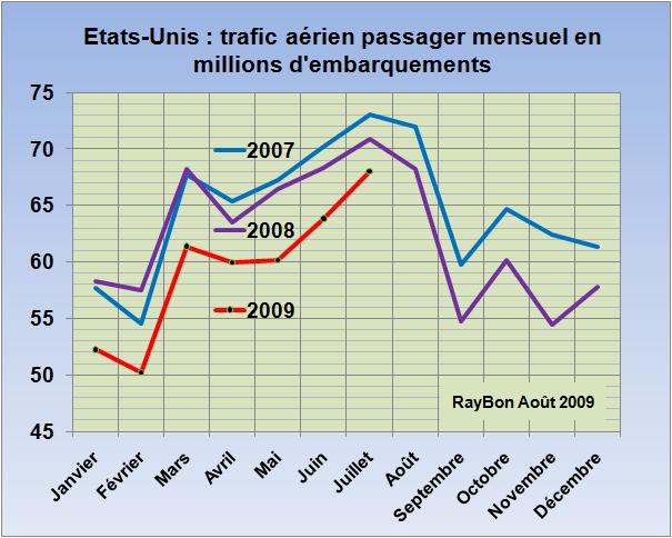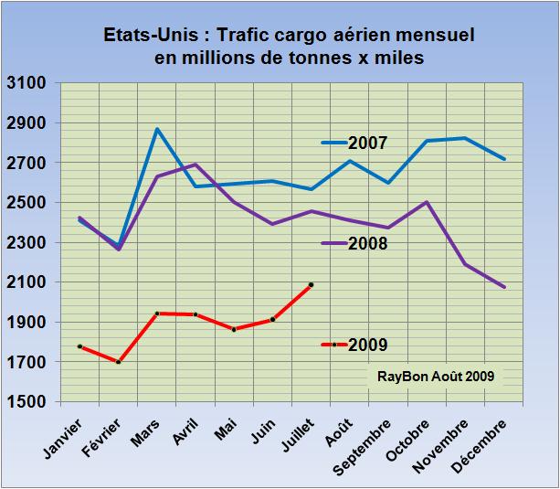 L’Air Transport Association (ATA) américaine qui publie tous les mois, depuis le début de la crise économique, un bulletin sur l’évolution du transport aérien à partir des données communiquées par ses membres, est un peu moins pessimiste que d’habitude sur les résultats en volumes du mois de Juillet. Le transport passager ne serait en retrait que de 4% par rapport au même mois de 2008, ce résultat est relativement encourageant par rapport à un -6,5% du mois de Juin et un -9,4% du mois de Mai. Pour le transport de fret c’est une baisse de 15% qui est annoncée, elle aussi en amélioration par rapport aux -20% de Juin et aux -25% du mois de Mai. Ces valeurs relatives recoupées avec les données du Bureau of Transportation Statistics, connues à fin Mai, permettent d’établir les courbes de données estimées à fin Juillet des trafics passager et cargo (FIG)
