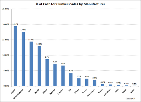 Les chiffres du programme américain Cash for Clunkers de 3 milliards de dollars qui vient de se terminer mettent en évidence les formidables réductions potentielles de consommation de carburant que peuvent faire les américains s’ils en ont, bien sûr, la volonté. Les 690114 très vieux véhicules mis à la casse, concernés par ce programme, présentaient une autonomie moyenne de 15,8 miles/gallon, ce qui en divisant 235 par ce nombre (LIRE) conduit à une consommation moyenne de 14,9 litres aux cent km. Ils ont été remplacés par des véhicules présentant une autonomie moyenne de 24,9 miles/gallon soit une consommation de 9,4 litres/cent km. Formidable progrès pour les Etats-Unis! Un calcul simple montre que sur un an de circulation moyenne des véhicules de 12000 miles, ce sont 4,6 millions de barils d’essence qui seront économisés. Cela représente une grosse demi-journée de consommation d’essence de ce grand pays énergivore.