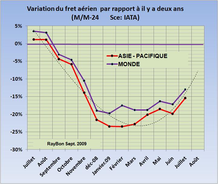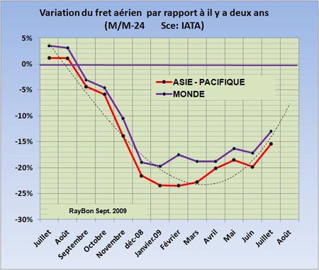 L’IATA publie mensuellement la variation du trafic aérien par rapport au même mois de l’année précédente. Cette méthode corrige les données des variations saisonnières importantes dans ce domaine d’activité économique. Mais la référence 2008 ayant connu de fortes variations avec l’arrivée de la crise économique, perceptible dès le mois de MAI dans le fret de la zone Asie-Pacifique par exemple, il est préférable pour mesurer des tendances de l’activité de rapporter ces activités à celles d’il y a deux ans (2007) qui étaient alors stables. La courbe de variation du fret aérien dans la zone Asie-Pacifique qui est un indicateur avancé (FIG., courbe rouge), montre une tendance à une moindre dégradation de l’activité. La valeur du mois de Juillet marque une détérioration de 15% par rapport au même mois de 2007, c’est en progression par rapport aux retraits observés en début d’année qui avaient atteint 23% par rapport aux volumes de fret d’il y a deux ans.