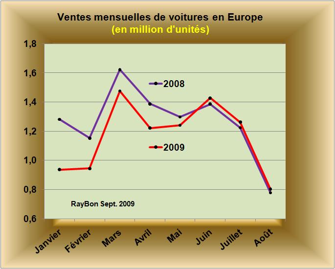 Grâce à des séances de ventilation, sous formes de nombreuses primes à la casse, mises en route un peu partout en Europe, l’industrie automobile européenne semble à peu près tenir le choc. Les volumes commandés en Juin, Juillet et Août ont atteint en cumulé les 3,49 millions d’exemplaires contre 3,39 millions un an auparavant (FIG.). L’Allemagne, à elle seule, a représenté 1,04 millions de ces commandes sur les trois derniers mois contre 0,78 million un an auparavant, soit une augmentation moyenne de 33% sur cette période. Ce résultat qui représente en valeur absolue et relative la plus forte croissance des ventes en Europe doit être crédité à la prime à la casse allemande qui a rencontré un vif succès. Des mesures analogues en France, en Grande-Bretagne, en Espagne, ont permis de faire croître ou au moins de limiter la chute dans les prises de commandes.