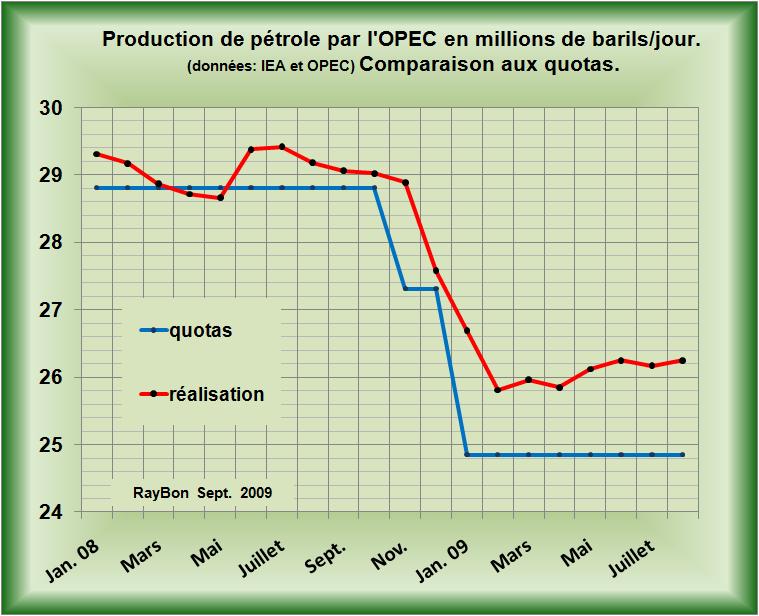 L’indiscipline proverbiale des pays de l’OPEP joue à fond, encouragée par des cours du brut qui ont miraculeusement dépassé les 70 dollars le baril. Les quotas décidés en Décembre 2008 ne sont plus qu’un vieux souvenir, d’un temps aux cours délabrés. Alors, peu à peu, l’OPEP écorne de plus en plus le contrat, pour atteindre une production au mois d’Août à 1,4 millions de barils de plus que l’allocation (FIG.II).