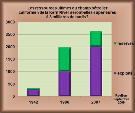 L’étude des productions de pétrole du champ pétrolier californien de la Kern River découvert il ya maintenant 110 ans est un cas d’école qui permet aux aficionados du peak oil de démontrer la validité de leurs prédictions mais qui permet aussi à des opinions plus progressistes de démonter la fragilité de ces démarches théoriques, dans un monde aux technologies et aux conditions économiques en perpétuelle évolution. Le cas du gisement de la Kern River est pris en exemple par Maugeri (LIRE) pour illustrer l’évolution des technologies d’exploitation pétrolières depuis 50 ans. En 1942 on estimait alors les ressources ultimes de ce pétrole à très forte viscosité aux environs de 350 millions de barils. Mais à partir de 1960 la mise en route progressive des techniques de récupérations des huiles visqueuses par des injections de vapeur d’eau a fait bondir les productions de quelques millions de barils par an à plus de 45 millions de barils par an entre 1980 et 2000. En 1986 un milliard de barils avait été extrait du sol depuis le tout début de l’exploitation et l’on estimait les réserves 2P (prouvées et probables) à un milliard de barils supplémentaires. En 2007 Chevron a annoncé que 2 milliards de barils avaient été extraits du sol, avec des réserves estimées à 600 millions de barils (FIG.I).