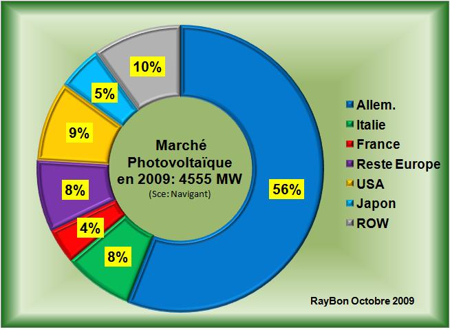 L’Allemagne se taille la part du lion avec 56% des installations, l’Europe occupe plus des trois quarts des achats mondiaux. Les Marchés américains, japonais et asiatiques ne sont pas à la hauteur de leurs bonnes volontés écologiques, ni à celle des ambitions de leurs industries photovoltaïques respectives.