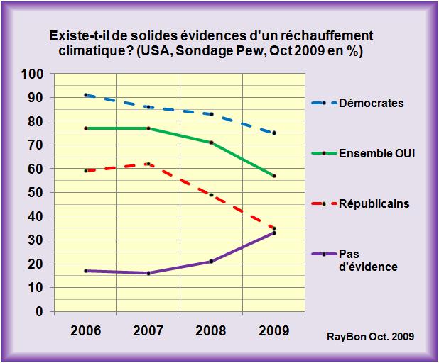Un sondage réalisé au début du mois par l’institut de sondages Pew Research auprès de 1500 américains indique que le réchauffement climatique fait de moins en moins recette dans ce grand pays. Ils étaient il y a un an 71% à affirmer qu’il existe de solides évidences d’un réchauffement climatique, ils ne sont plus que 57% cette année à répondre positivement. Inversement ils étaient 21% il y a un an pour affirmer qu’il n’existe aucune évidence sérieuse, ils sont 33% cette année.