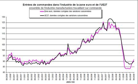 Les entrées de commandes dans l’industrie dans la Zone Euro au mois d’Août se sont accrues de 2% titre Eurostat. Pour être totalement objectif il aurait fallu ajouter « et elles sont revenues au niveau de celles d’il y a six ans en arrière » (FIG.I). Piètre performance dans une Europe à l’économie dopée par tous les plans de relance et autres primes à la casse. Dans les faits, les entrées de commandes de la ZE sont en retrait de 28% par rapport à celles enregistrées il y a deux ans, dont 29% pour l’Allemagne et 23% pour la France. Une telle nouvelle ne peut que rendre pessimiste sur les facturations de la fin de l’année.