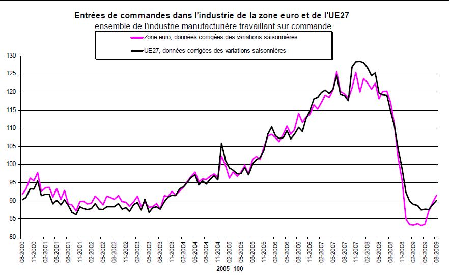 Les entrées de commandes dans l’industrie dans la Zone Euro au mois d’Août se sont accrues de 2% titre Eurostat. Pour être totalement objectif il aurait fallu ajouter « et elles sont revenues au niveau de celles d’il y a six ans en arrière » (FIG.I). Piètre performance dans une Europe à l’économie dopée par tous les plans de relance et autres primes à la casse. Dans les faits, les entrées de commandes de la ZE sont en retrait de 28% par rapport à celles enregistrées il y a deux ans, dont 29% pour l’Allemagne et 23% pour la France. Une telle nouvelle ne peut que rendre pessimiste sur les facturations de la fin de l’année.