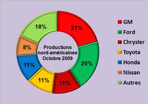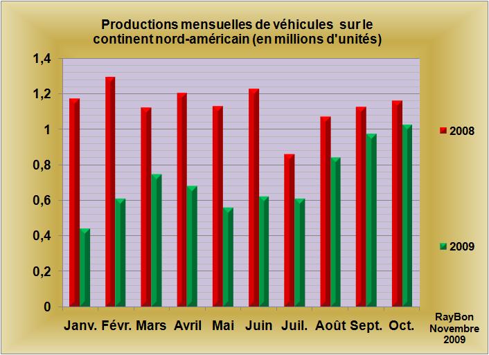 Les relevés de production de voitures et autres 4X4 sur le Continent nord-américain dévoilent que les productions durant le mois d’Octobre ont dépassé le million d’exemplaires à 1,023 million, ce qui correspond à une capacité d’utilisation de l’outil de production de 64%. Les Trois Grosses américaines qui ont beaucoup maigri, ont produit 52% de véhicules. Les trois japonaises ont assuré 30% des volumes produits. Ce bon niveau global de production devrait se poursuivre au mois de Novembre avec un taux d’utilisation de l’outil de production qui devrait se maintenir vers les 64%. Par contre le mois de Décembre ne semble être chargé, pour l’instant, qu’à hauteur des 51% de ses capacités. La prime à la casse américaine du mois d’Août aura globalement sauvé la fin de l’année de cette industrie.