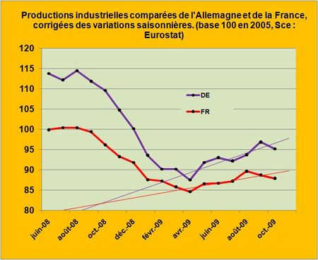 Tous les indicateurs avancés tels que les entrées de commandes (LIRE) ou le fret aérien (LIRE) nous ont appris qu’il ne fallait pas espérer de reprise franche de l’activité en Europe pour cette fin d’année ou pour le début de 2010. Les chiffres publiés par Eurostat de l’activité industrielle du mois d’Octobre viennent malheureusement confirmer ces légitimes suspicions. La production industrielle européenne marque le pas à des niveaux très, très bas, ceux de la décennie précédente. La reprise de l’activité industrielle est quasiment inexistante en France, elle est nonchalante en Allemagne (FIG.).