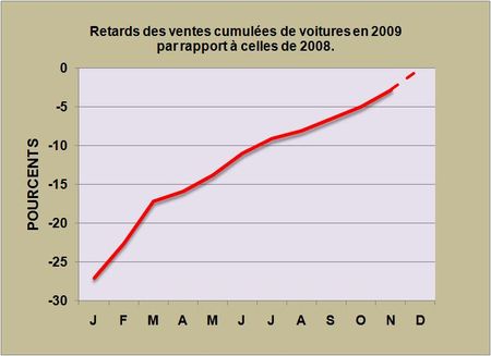 En début d’année 2009 personne n’aurait parié un centime d’euro sur le fait que les immatriculations de voitures en Europe atteindraient celles de 2008. Après un démarrage catastrophique au mois de Janvier à -27% par rapport à celles du même mois en 2008, les ventes n’ont cessé de se rétablir de façon continue tout au long de l’année pour afficher un timide -2,8% au mois de Novembre qui augure un score proche de zéro en fin d’année (FIG.).