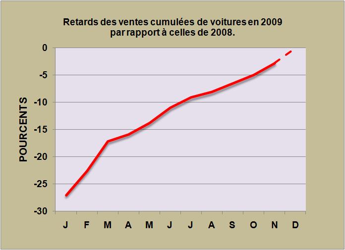 En début d’année 2009 personne n’aurait parié un centime d’euro sur le fait que les immatriculations de voitures en Europe atteindraient celles de 2008. Après un démarrage catastrophique au mois de Janvier à -27% par rapport à celles du même mois en 2008, les ventes n’ont cessé de se rétablir de façon continue tout au long de l’année pour afficher un timide -2,8% au mois de Novembre qui augure un score proche de zéro en fin d’année (FIG.).