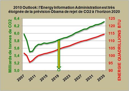 L’Energy Information Administration vient de publier un pre-print de son Annual Energy Outlook 2010 dans lequel, comme d’habitude, elle prévoit une croissance continue des consommations d’énergie aux Etats-Unis. Cette année cette progression serait de 0,5% par an en moyenne d’ici à 2035, accompagnée de rejets de CO2 en croissance annuelle de 0,3% (FIG.). Ce genre de travail ne présente qu’un intérêt douteux puisqu’il n’intègre aucune politique d’infléchissement politique majeur dans les choix énergétiques américains d’ici à 2035. Il est en tous les cas en contradiction (flèche) avec l’annonce, déjà prudente, du Président Obama de vouloir réduire les émissions de CO2 américaines à 5 milliards de tonnes en 2020 (LIRE).