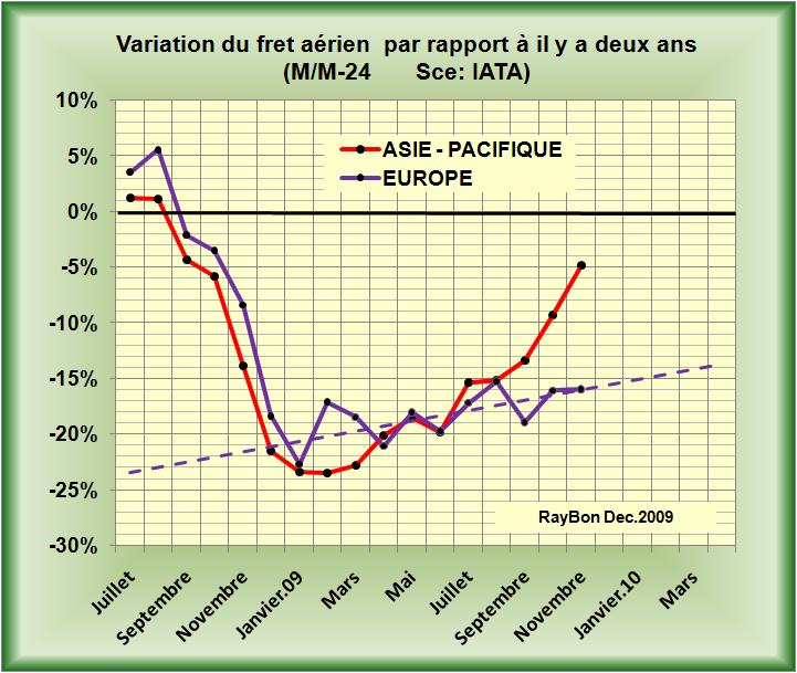 La mesure de la variation du fret aérien qui quantifie les variations de flux à caractère urgent ou important dans les échanges commerciaux, constitue un indicateur avancé de la conjoncture économique dans une zone considérée. L’IATA vient de publier les variations du mois de Novembre qui font apparaître une progression du fret aérien dans la Zone Asie-Pacifique de 15,5% par rapport à il y a un an. Cette référence située en pleine crise, étant éminemment instable il est préférable, en ce moment, de rapporter cette indicateur à la référence d’il y a deux ans qui était alors beaucoup plus stable. Il apparaît alors (FIG., courbe rouge) un puissant mouvement de rattrapage du fret de cette Zone qui devrait rejoindre, vers la fin de l’année, ses niveaux d’il y a deux ans.