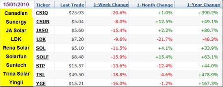 Le marché mondial des modules photovoltaïques en 2009 a été sauvé par de très fortes demandes d’équipements en provenance du marché allemand. Ces besoins locaux auraient atteint les 4000 MW soit 1300 MW de plus que prévu par les acteurs du marché, le tout sur la conviction que les tarifs préférentiels allemands d’achat d’électricité photovoltaïque allaient être revus à la baisse en 2010. La rumeur, reportée par Reuters, faisant savoir que les autorités allemandes allaient faire baisser ces tarifs de 17% dès le mois d’Avril vient d’avoir l’effet d’une bombe sur les cours des Sociétés du PV mondial. Tout d’abord les Groupes chinois qui exportent massivement en Allemagne ont vu leurs cours de bourse fortement reculer dans la semaine (TAB.) aves un record pour Canadian Solar, action très travaillée, qui a reculé de plus de 20%.