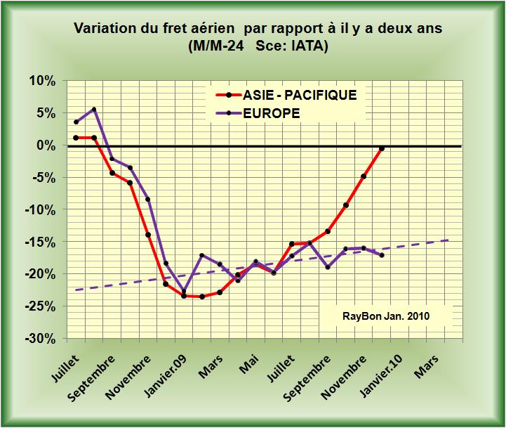 Le fret aérien qui concerne essentiellement les produits échangés à forte valeur ajoutée ou à caractère urgent, est un indicateur avancé de l’activité économique. Il a été montré ici combien la comparaison entre cet indicateur dans la zone Asie-Pacifique et celui dans la zone Europe était discriminante. Les valeurs publiées par l’IATA pour le mois de Décembre confirment à la fois le dynamisme de la zone Asie et la nonchalance économique de l’Europe. Après 16 mois de crise et de rétablissement, le trafic aérien en Asie a retrouvé son niveau d’il y a deux ans. Remarquable performance du dynamisme économique de cette zone, alors que l’inquiétant trafic de fret en Europe se traîne sans aucun tonus (FIG., courbe violette).