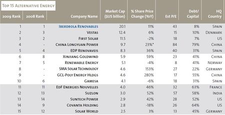 Dans le TOP15 des énergies renouvelables c’est toujours l’espagnol Iberdrola Renovables qui tient la tête du classement avec une capitalisation boursière de 20 mrds$, suivi du danois Vestas leader mondial des éoliennes et de l’américain FirstSolar leader mondial des modules photovoltaïques en couches minces (TAB.). Mais le fait marquant est l’arrivée en force de quelques nouveaux venus comme China Longyuan Power en quatrième place, coté à Hong Kong et impliqué entre autres activités dans la production de Silicium ou le chinois GCL Poly Energy impliqué dans les énergies renouvelables. L’allemand SMA Solar Technology qui rejoint le classement produit des onduleurs pour les applications photovoltaïques.