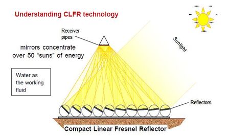 Les mérites de la technologie Ausra (FIG.) résident dans une technologie rustique de chauffage de vapeur d’eau en circulation dans un récepteur linéaire à l’aide du rayonnement solaire réfléchi par de simples miroirs de Fresnel. A tout moment, ces miroirs focalisent le rayonnement solaire sur le récepteur. La vapeur est ainsi portée à 370°C sous 100 bars de pression. L’absence d’échangeur de chaleur, le refroidissement par air de la source froide en font une technologie appropriée aux conditions quasi-désertiques où opèrent ces systèmes. Une implantation compacte des réflecteurs permet également d’optimiser le rendement énergétique à l’hectare des installations.