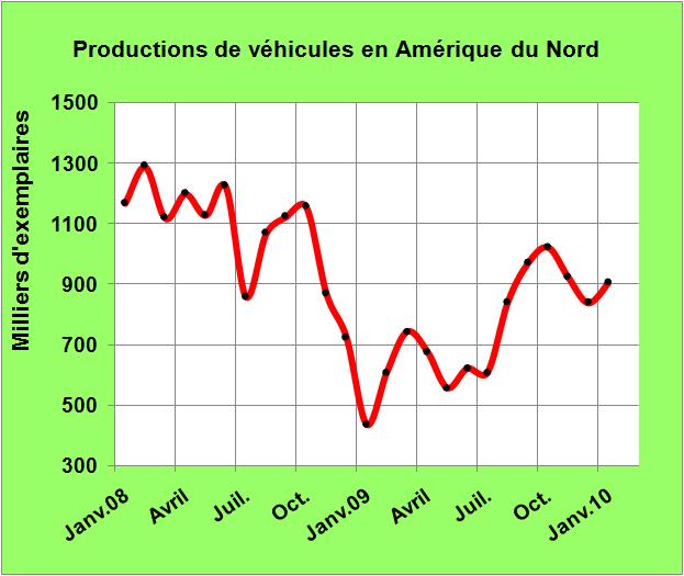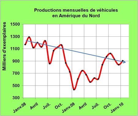 Janvier 2009, avec 435 mille exemplaires, avait été un mois catastrophique pour la production de véhicules en Amérique du Nord. Janvier 2010 avec un peu plus de 900 mille exemplaires affiche donc une superbe performance relative. Mais ces scores de productions méritent d’être mis en perspective (FIG.). Il est alors possible de constater que ce début 2010 s’inscrit dans la moyenne des productions des six derniers mois et que ce niveau d’activité est largement en retrait par rapport à celui du début 2008.
