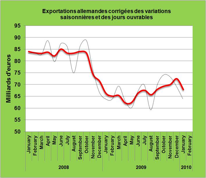 Tout se passe comme si le monde n’avait plus besoin des équipements et des fournitures européens trop chers, trop sophistiqués, trop datés sinon dépassés. La France a validé cette évidente constatation avec son échec devant les coréens pour la vente d’une centrale nucléaire, la rumeur semble dire qu’il en serait de même devant les chinois pour la fourniture de TGV à l’Arabie Saoudite. Sans parler des avions ravitailleurs EADS pour l’armée de l’air américaine, pour lesquels l’obstacle, totalement politique et désinvolte, montre ainsi la faible importance qu’attache l’Administration américaine à ses bonnes relations avec l’Europe. L’Europe du libre échange et de la libre concurrence, en phase de repli sur elle même, se retrouve complètement larguée. Cette tendance se retrouve même dans les chiffres du commerce allemand avec le reste du monde dont les exportations ressortent en repli, par rapport à celles du mois de Décembre (-6%), stables par rapport à celles du triste mois de Janvier 2009 et donc en retrait à euros courants de 23% par rapport aux valeurs du mois de Janvier 2008 (FIG., en pointillés les valeurs brutes). La part de ces exportations pour les deux tiers en direction de l’Europe étouffée par un euro germanique est en léger repli (-1,1% dont -2,1% pour l’eurozone) et la part vers le reste du monde est en légère progression (+2,5%) par rapport à il y a un an.