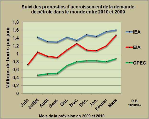 Remarque: ces prévisions mondiales de consommations pour 2010 qui sont au mois de Mars de 85.24 (OPEC), 85.51 (EIA) et 86 (IEA) millions de barils/jour, englobent le pétrole brut, les gaz comprimés liquéfiés et les biocarburants. Les variations 2010/2009 représentent celles de la demande finale. Pour avoir la variation de la demande en pétrole il faut intégrer une hypothèse de variation des usages de biocarburants. Entre Janvier 2009 et Janvier 2010 la production mondiale de biocarburants est passée de 1,68 à 1,93 millions de barils/jour. En supposant cet accroissement constant tout au long de 2010 il faut donc soustraire 0,25 million de barils aux chiffres indiqués pour avoir la pression exercée sur la ressource pétrolière.